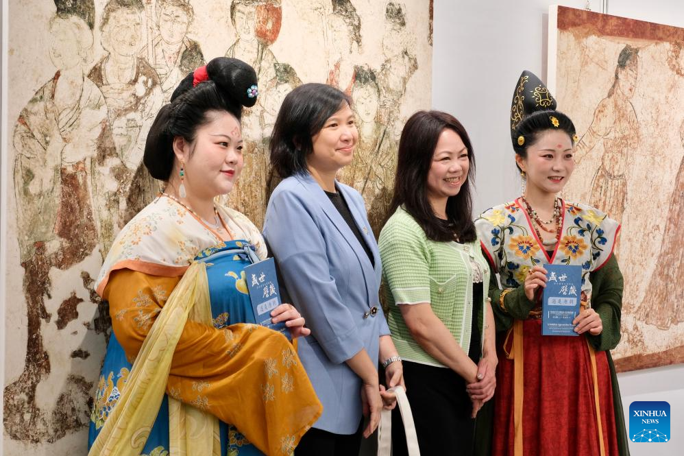 Guests visit "A Golden Age on the Walls", a special exhibition on Tang Dynasty (618-907) murals, in Macao, south China, April 30, 2024. The exhibition will be held till May 11. (Xinhua/Guo Yuqi)