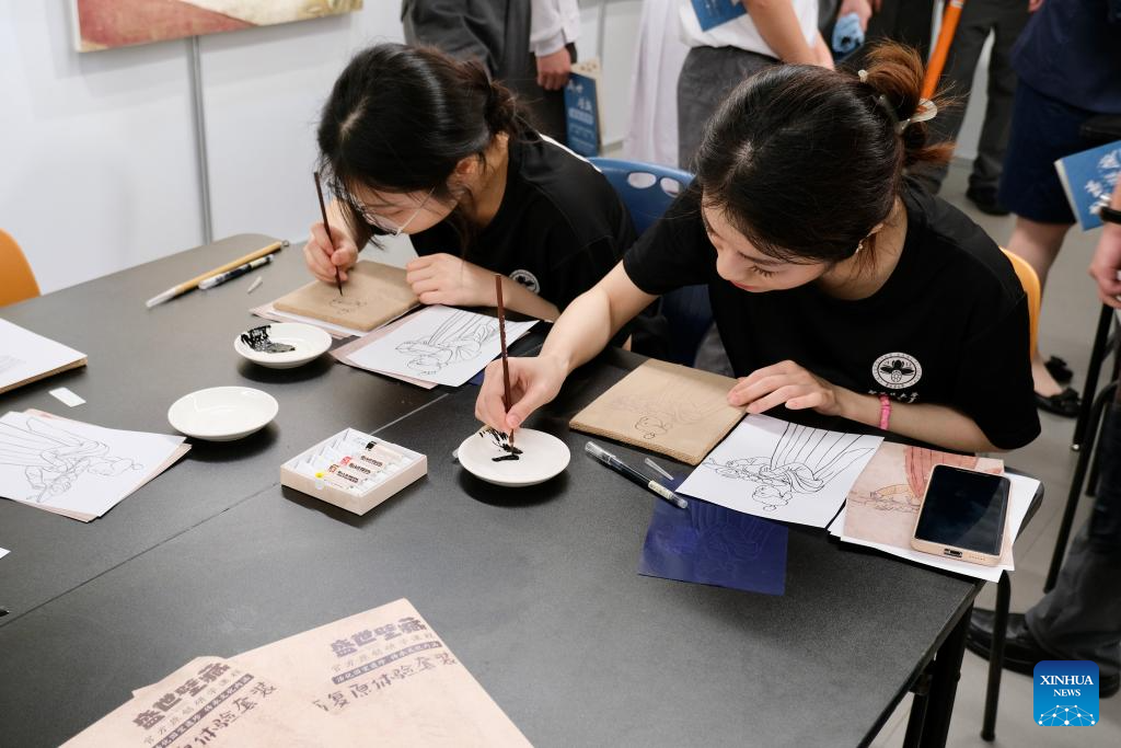 Students make replicas of murals during "A Golden Age on the Walls", a special exhibition on Tang Dynasty (618-907) murals, in Macao, south China, April 30, 2024. The exhibition will be held till May 11. (Xinhua/Guo Yuqi)