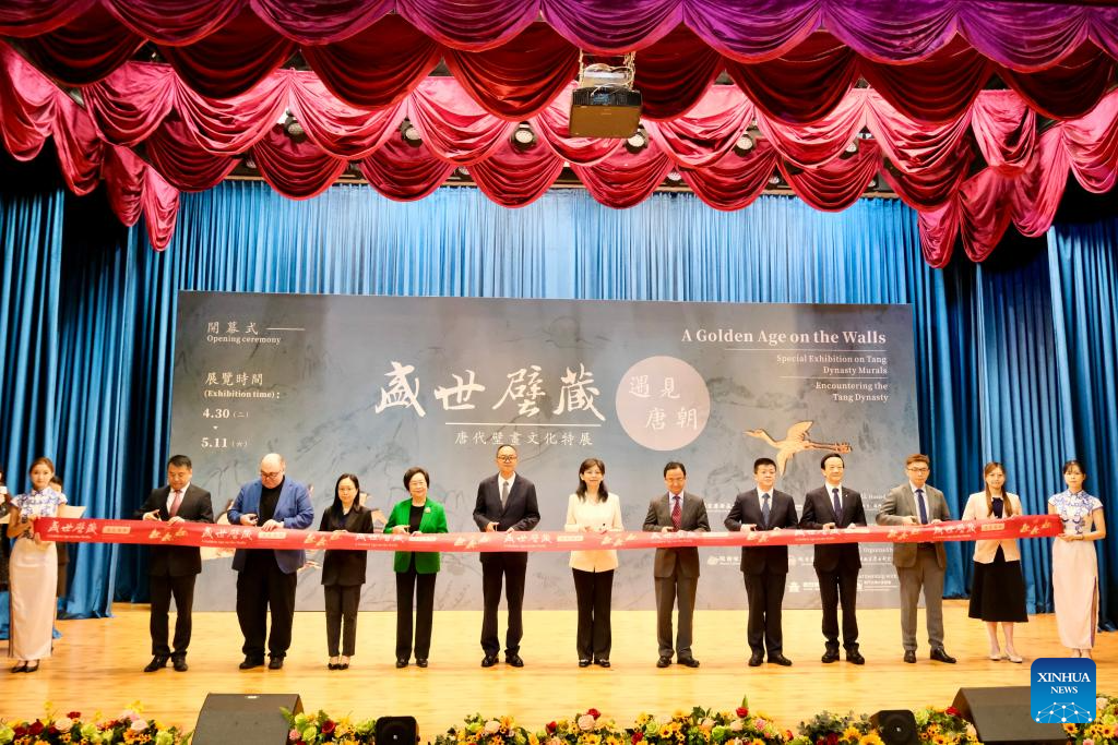 Guests cut a ribbon at the opening ceremony of "A Golden Age on the Walls", a special exhibition on Tang Dynasty (618-907) murals, in Macao, south China, April 30, 2024. The exhibition will be held till May 11. (Xinhua/Guo Yuqi)