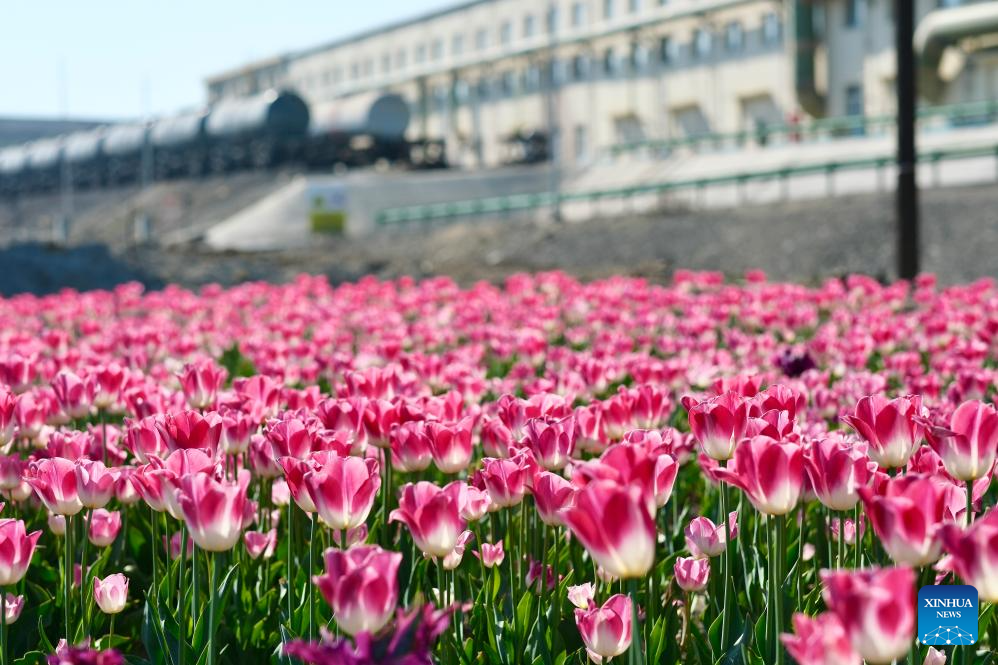 This photo taken on April 11, 2024 shows tulips at the smeltery of Serbia Zijin Copper DOO in Bor, Serbia. The city of Bor in Serbia is rich in copper resources. Zijin Mining Group built new and advanced production facilities in the Serbian company and set new standards for environment-friendly mining. (Xinhua/Zheng Kaijun)