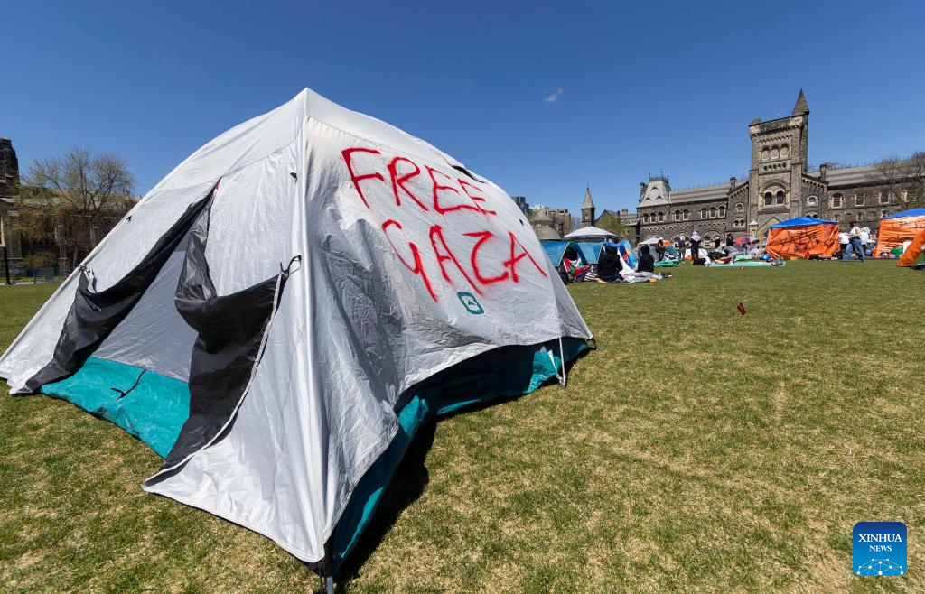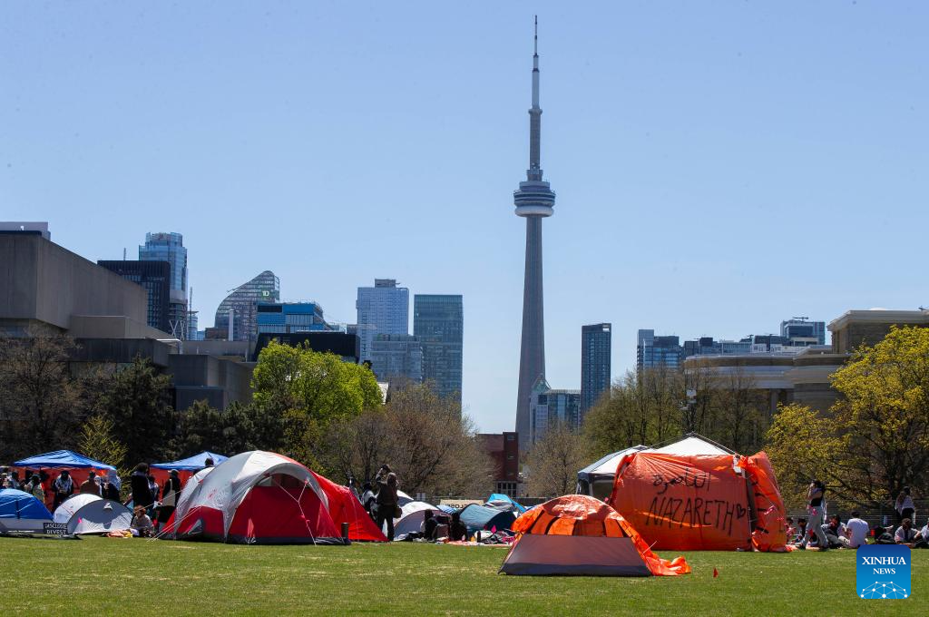 Pro-Palestinian demonstrators are seen in an encampment of tents at St. George Campus of the University of Toronto in Toronto, Canada, on May 2, 2024. (Photo by Zou Zheng/Xinhua)