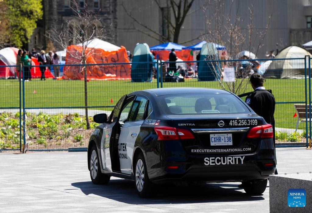 A security member watches as pro-Palestinian demonstrators gather in an encampment of tents at St. George Campus of the University of Toronto in Toronto, Canada, on May 2, 2024. (Photo by Zou Zheng/Xinhua)