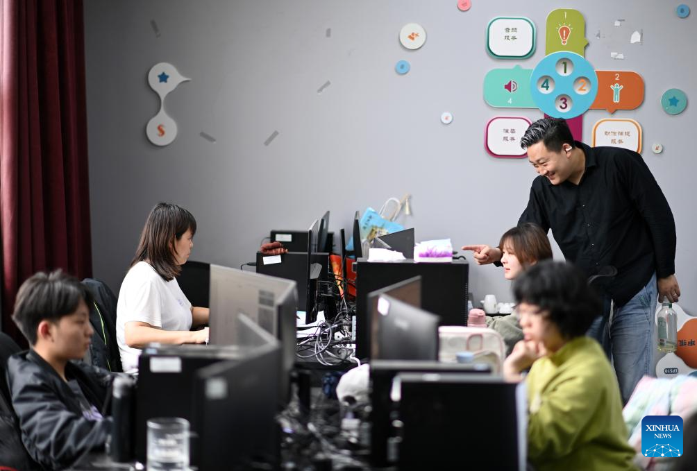 Cui Shengji (1st R) discusses with his colleagues at an office in the National Animation Industry Park, Binhai New Area, north China's Tianjin Municipality, April 23, 2024. (Xinhua/Zhao Zishuo)