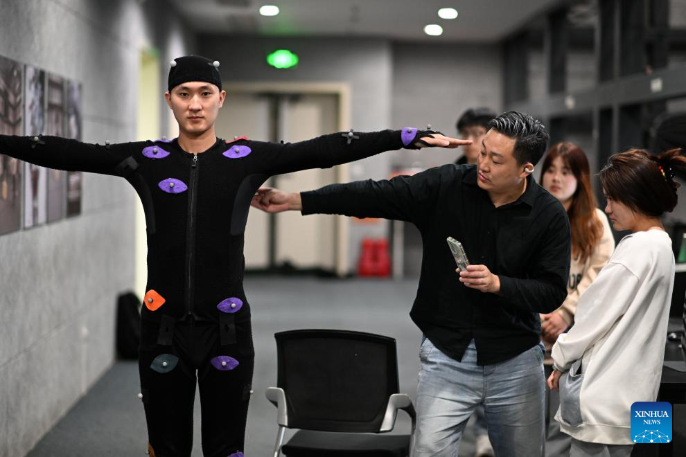 Ma Xinqi performs at a motion capture booth in the National Animation Industry Park in Binhai New Area, north China's Tianjin Municipality, April 23, 2024. (Xinhua/Zhao Zishuo)