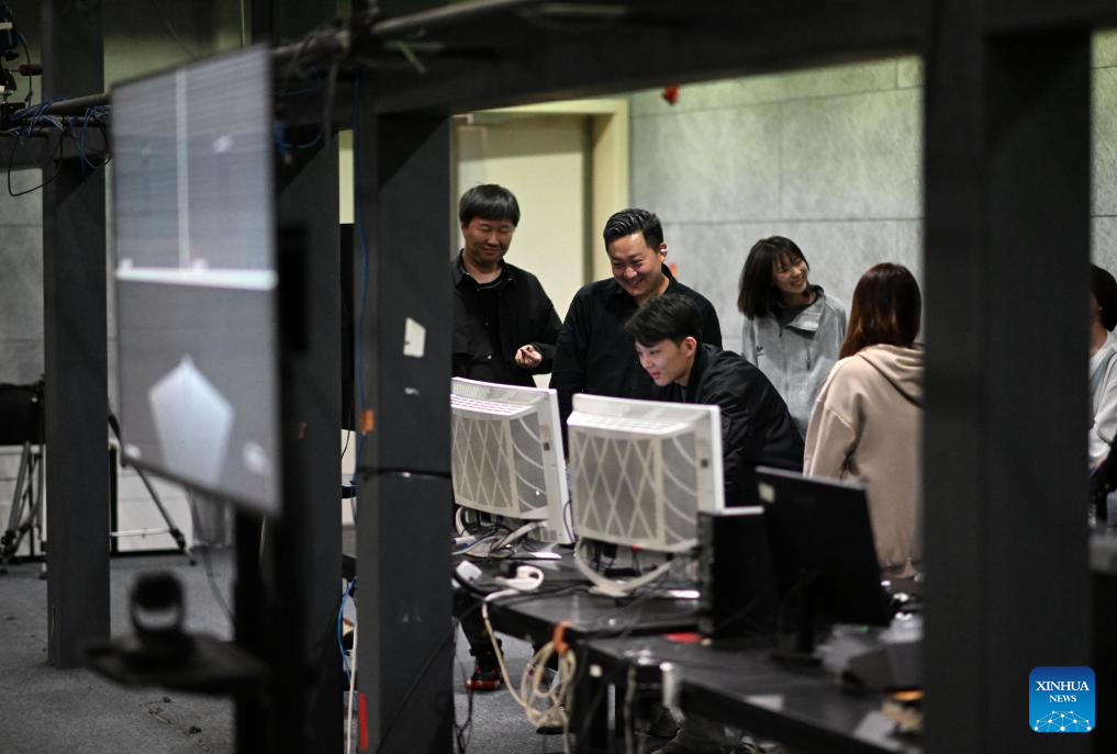 Cui Shengji (2nd L) and his colleagues check data at a motion capture booth in the National Animation Industry Park, Binhai New Area, north China's Tianjin Municipality, April 23, 2024. (Xinhua/Zhao Zishuo)