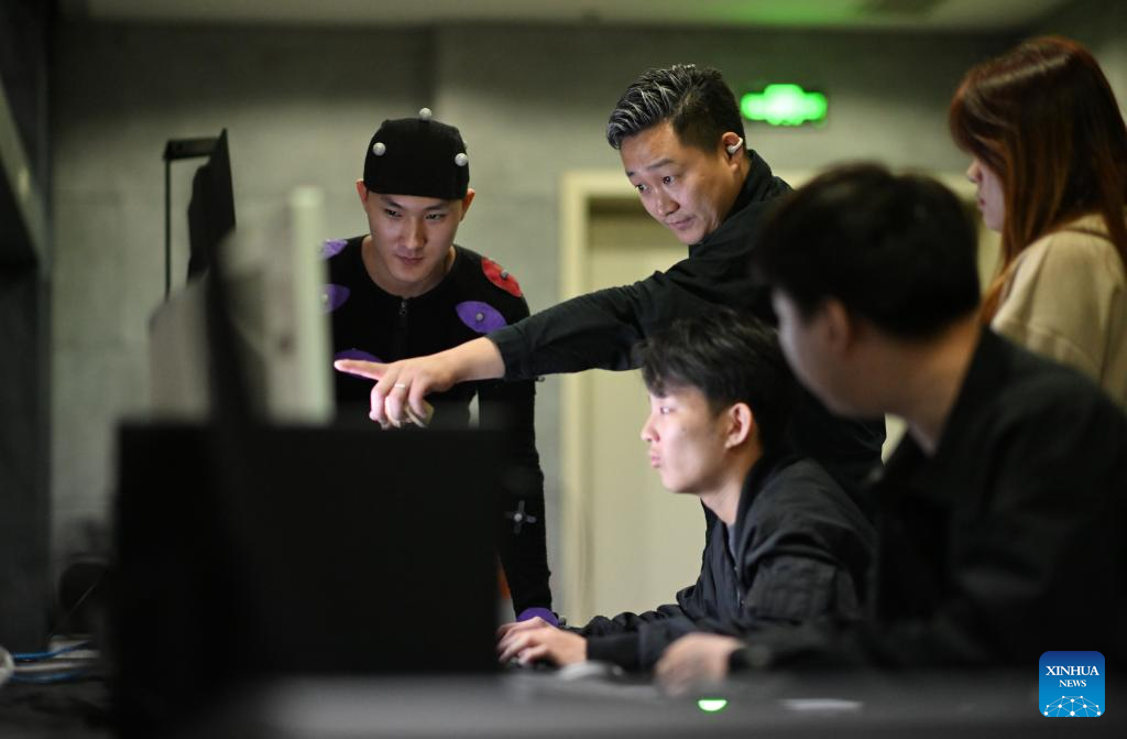 Cui Shengji (C) briefs the movements of a motion capture actor to his colleagues at a motion capture booth c the National Animation Industry Park, Binhai New Area, north China's Tianjin Municipality, April 23, 2024. (Xinhua/Zhao Zishuo)