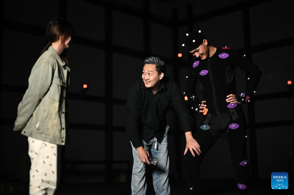 Cui Shengji (C) briefs the movements of a motion capture actor to a colleague at a motion capture booth in the National Animation Industry Park, Binhai New Area, north China's Tianjin Municipality, April 23, 2024. (Xinhua/Zhao Zishuo)