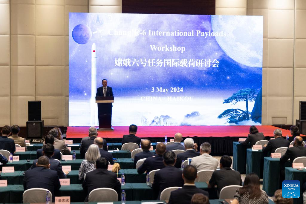 A workshop focusing on the international payloads carried by Chang'e-6 is held in Haikou, south China's Hainan Province, May 3, 2024. Guests invited by the China National Space Administration (CNSA) attended a workshop focusing on the international payloads carried by Chang'e-6 here on Friday. (Xinhua/Jin Liwang)