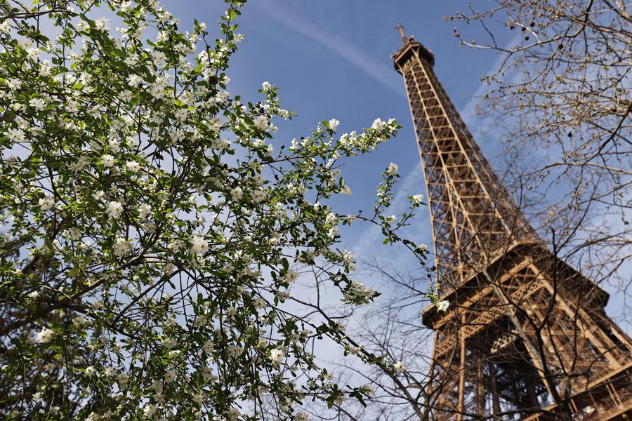 Trees bloom at the Champ de Mars near the Eiffel Tower in Paris, France, March 20, 2024. (Xinhua/Gao Jing)