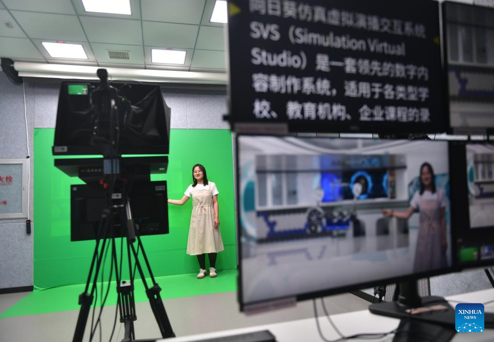 A staff member demonstrates a course recording via simulation virtual studio at Sunflower Digital Technology in Shenyang, northeast China's Liaoning Province, May 7, 2024. In recent years, Liaoning Province has actively fostered an environment conducive to the development of the software industry and nurtured clusters of software enterprises. (Xinhua/Yang Qing)