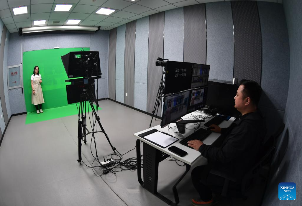 Staff members demonstrate a course recording via simulation virtual studio at Sunflower Digital Technology in Shenyang, northeast China's Liaoning Province, May 7, 2024. In recent years, Liaoning Province has actively fostered an environment conducive to the development of the software industry and nurtured clusters of software enterprises. (Xinhua/Yang Qing)