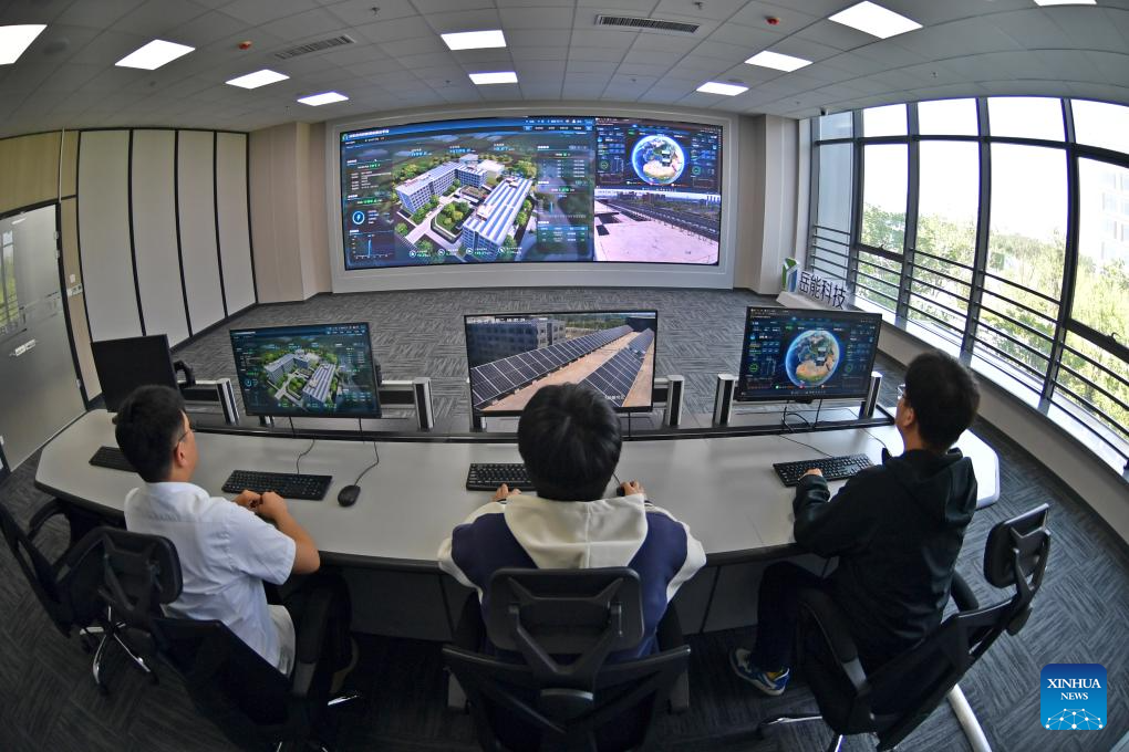 Staff members monitor the operation of photovoltaic system at Yueneng Technology in Shenyang, northeast China's Liaoning Province, May 7, 2024. In recent years, Liaoning Province has actively fostered an environment conducive to the development of the software industry and nurtured clusters of software enterprises. (Xinhua/Yang Qing)