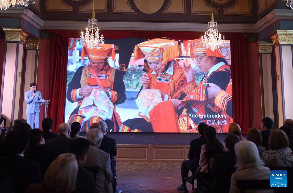 People watch a slideshow of Yao Embroidery during a Guangxi culture and tourism promotion event in Vienna, Austria, on May 7, 2024. (Xinhua/He Canling)