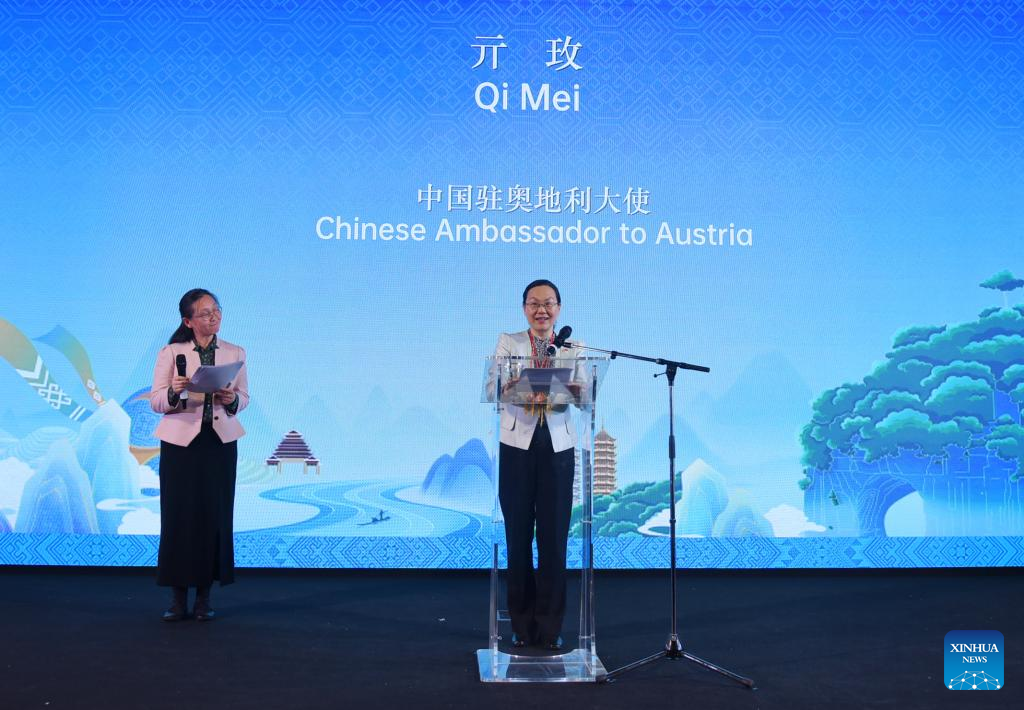 Chinese Ambassador to Austria Qi Mei (R) speaks during a Guangxi culture and tourism promotion event in Vienna, Austria, on May 7, 2024. (Xinhua/He Canling)