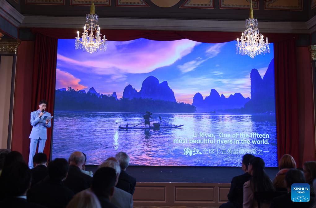 People watch a slideshow of Li River during a Guangxi culture and tourism promotion event in Vienna, Austria, on May 7, 2024. (Xinhua/He Canling)
