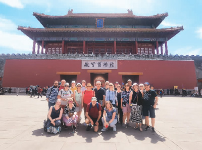 Tourists from the U.K. pose for a group photo in front of the Palace Museum in Beijing. (Photo courtesy of CTG Travel)