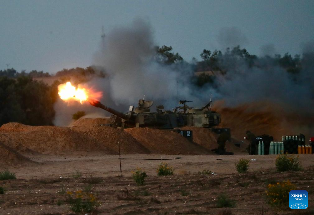 An Israeli self-propelled howitzer fires a shell to the Gaza Strip near the Kerem Shalom crossing in southern Israel, on May 8, 2024. Israel's army announced on Wednesday that it was continuing its ground assault on Gaza's Rafah, reporting approximately 30 casualties since the offensive began on Monday night. According to an army statement, the 30 casualties were militants, while Gaza health officials reported about 35 deaths, including a four-month-old baby. (Photo by Jamal Awad/Xinhua)