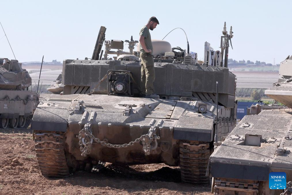 Israeli armored vehicles are deployed near the Kerem Shalom crossing in southern Israel, on May 8, 2024. Israel's army announced on Wednesday that it was continuing its ground assault on Gaza's Rafah, reporting approximately 30 casualties since the offensive began on Monday night. According to an army statement, the 30 casualties were militants, while Gaza health officials reported about 35 deaths, including a four-month-old baby. (Ilan Assayag/JINI via Xinhua)