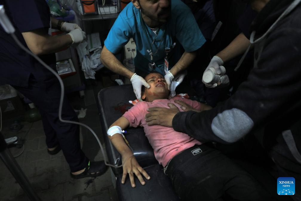 An injured child is treated at a hospital in the southern Gaza Strip city of Rafah, on May 8, 2024. Israel's army announced on Wednesday that it was continuing its ground assault on Gaza's Rafah, reporting approximately 30 casualties since the offensive began on Monday night. According to an army statement, the 30 casualties were militants, while Gaza health officials reported about 35 deaths, including a four-month-old baby. (Photo by Rizek Abdeljawad/Xinhua)