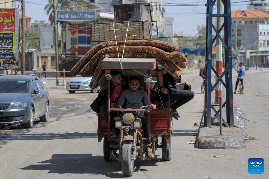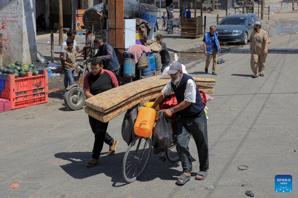 People leave their home in the southern Gaza Strip city of Rafah, on May 8, 2024. Israel's army announced on Wednesday that it was continuing its ground assault on Gaza's Rafah, reporting approximately 30 casualties since the offensive began on Monday night. According to an army statement, the 30 casualties were militants, while Gaza health officials reported about 35 deaths, including a four-month-old baby. (Photo by Rizek Abdeljawad/Xinhua)