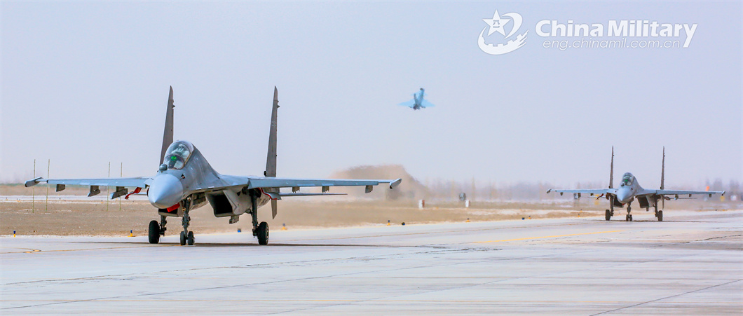 A J-16 fighter jet attached to an aviation brigade under the PLA Air Force takes off in speed during a round-the-clock confrontational air-battle training exercise in April, 2023. (eng.chinamil.com.cn/Photo by Liu Dezheng)