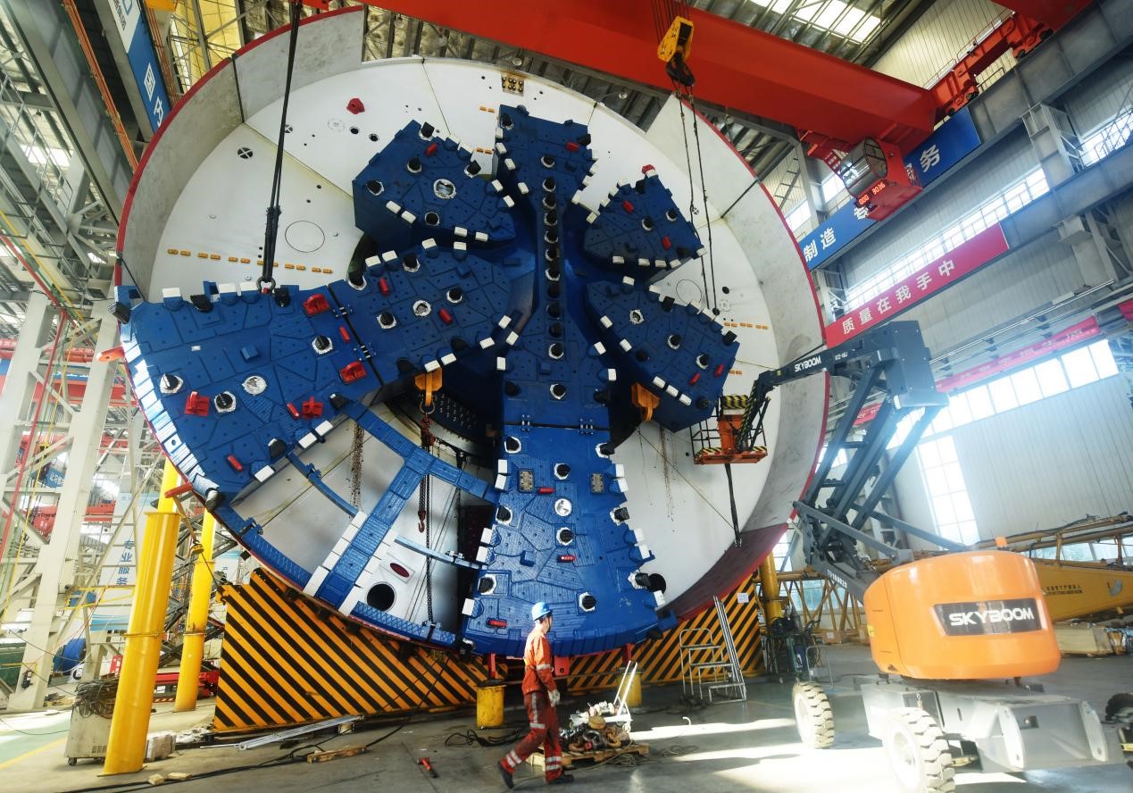 An ultra-large diameter tunnel boring machine (TBM) rolls off the production line in Changsha, central China's Hunan province, February 26, 2024. (People's Daily Online/Li Jian)