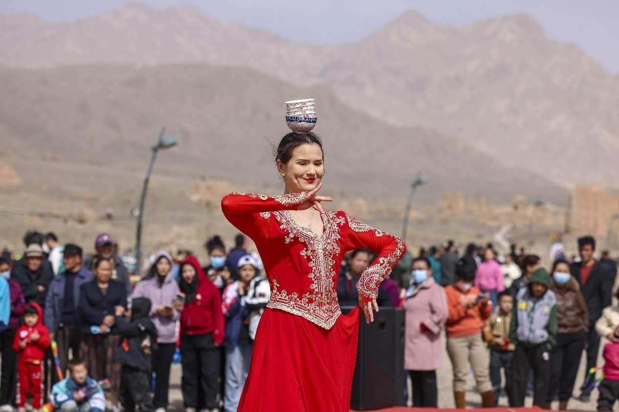 A performance is staged near a scenic spot in Kuqa, northwest China's Xinjiang Uygur autonomous region. (People's Daily Online/Yuan Huanhuan)
