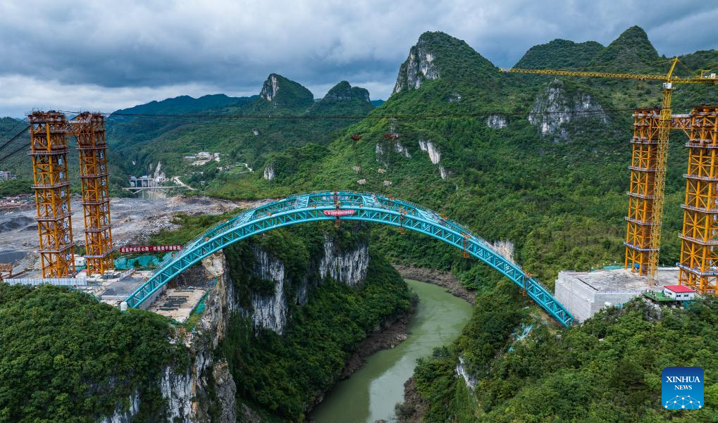A worker works at the construction site of the Lami River bridge along the Guiyang-Pingtang expressway in southwest China's Guizhou Province, May 10, 2024. The bridge, with a total length of 206 meters, saw its arch ribs closed on Friday. (Xinhua/Tao Liang)