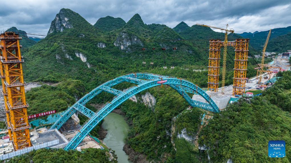 A drone photo taken on May 10, 2024 shows the construction site of the Lami River bridge along the Guiyang-Pingtang expressway in southwest China's Guizhou Province. The bridge, with a total length of 206 meters, saw its arch ribs closed on Friday. (Xinhua/Tao Liang)