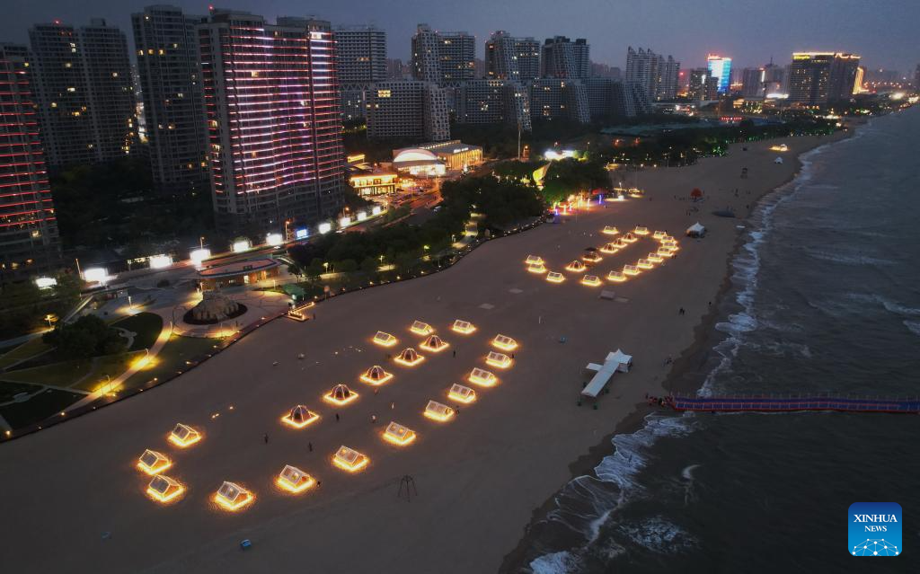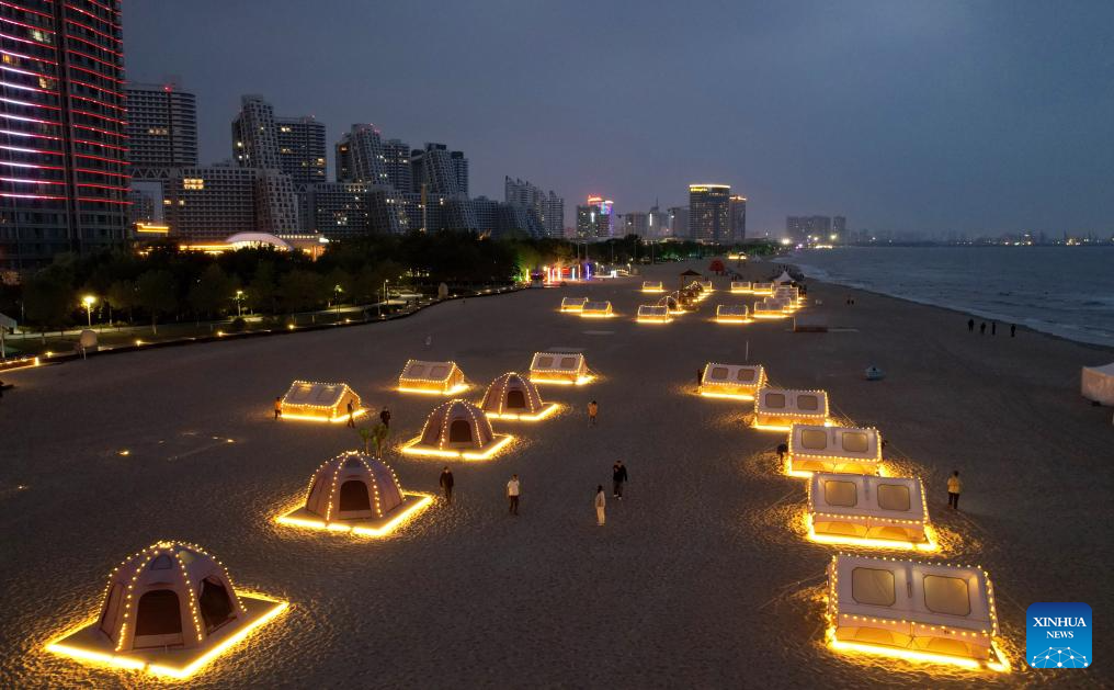 Tourists enjoy themselves by a tent at a camping site of a coastal scenic area in Qinhuangdao, north China's Hebei Province. The newly opened camping attracts tourists to experience the fun of camping. (Xinhua/Yang Shiyao)