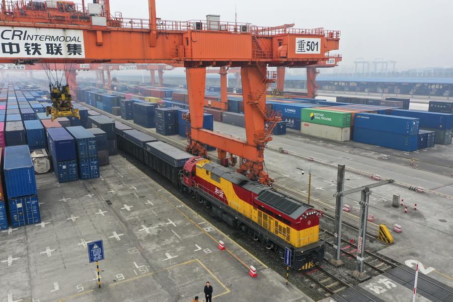 This aerial photo shows a rail-sea intermodal freight train carrying containers of goods, including cars, motorcycles, engines, and sodium carbonate, at Tuanjie Village Central Station in southwest China's Chongqing, Jan. 22, 2023. (Xinhua/Liu Chan)