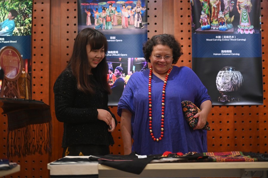 Running until May 17, the exhibition features a variety of artifacts and photographs representing cultural heritage from south China's Hainan Province, including Li brocade, Miao embroidery and Qiong opera.