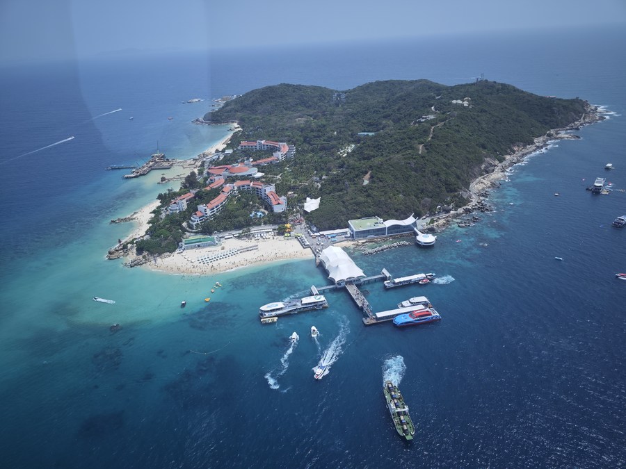 This photo taken during a helicopter aerial tour on March 21, 2024 shows Wuzhizhou Island in Sanya, south China's Hainan Province. (Xinhua/Zhou Huimin)