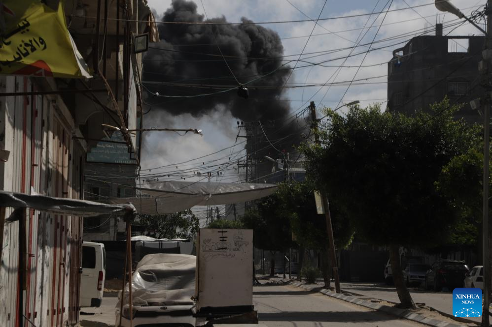 Smoke rises following Israeli strikes in Jabaliya refugee camp, northern Gaza Strip, on May 13, 2024. (Photo by Abdul Rahman Salama/Xinhua)