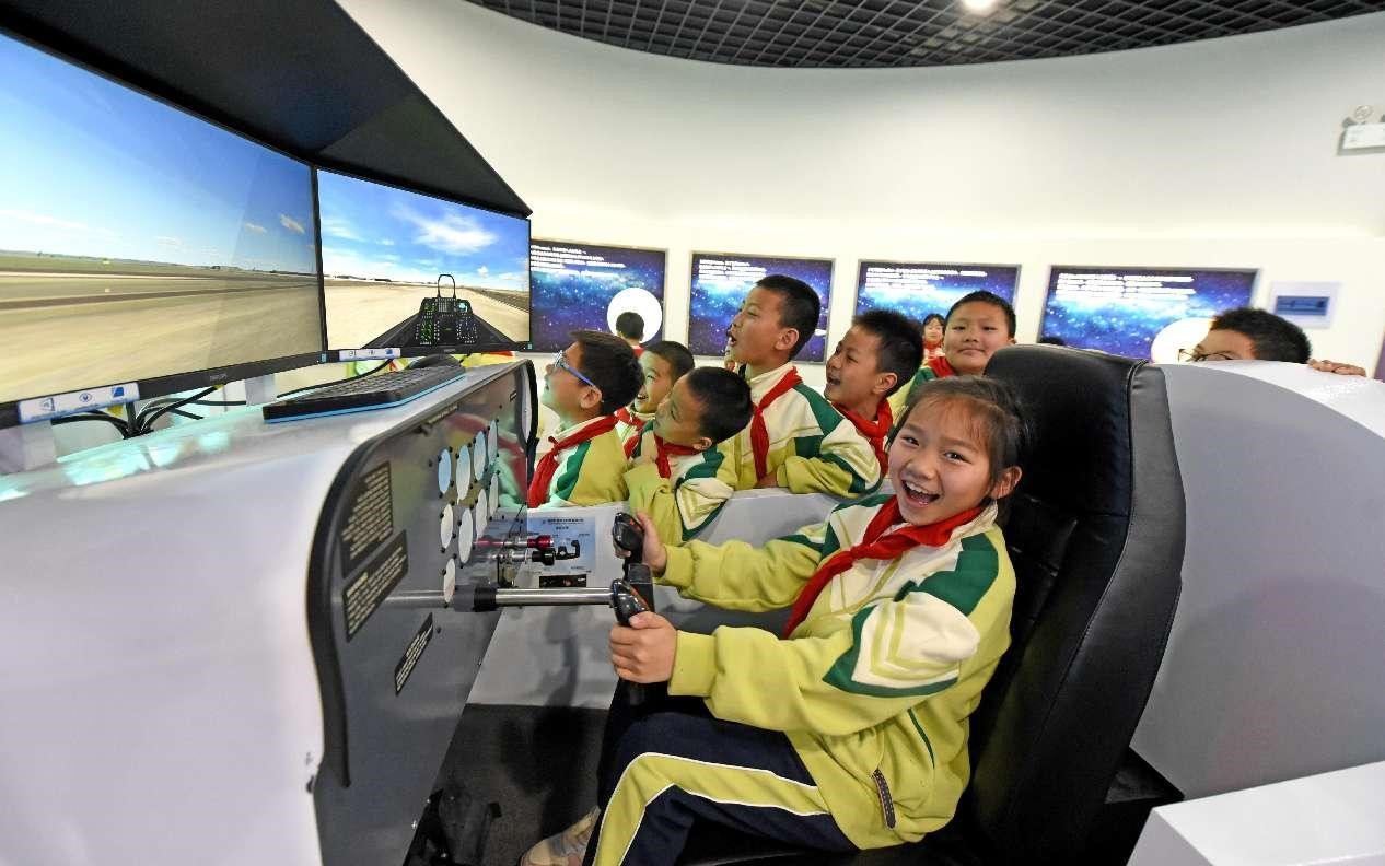 Students of a primary school in Xianju county, Taizhou, east China's Zhejiang province operate flight simulators at the science and technology museum of the school. (People's Daily Online/Wang Huabin)