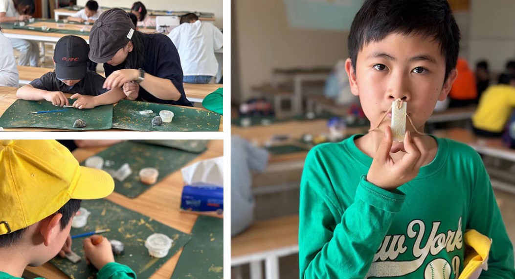 At the simulated archaeological site, students listen to instructors explaining the significant building ruins, ash pits, and the No. 2 sacrificial pit of the Sanxingdui site. After learning operation procedures, the students then pick up archaeological tools and follow the correct methods to excavate pre-buried replicas of bronze human heads and ivory artifacts.
