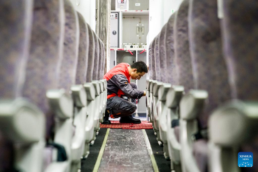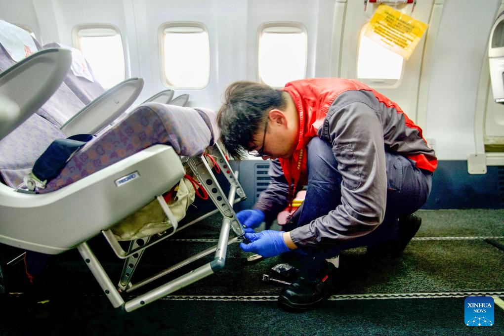 A staff member of Grand China Aviation Maintenance Co., Ltd. (GCAM) operates inside the cabin of an inbound airplane at a hangar of an aircraft maintenance base in Haikou, south China's Hainan Province, May 13, 2024. (Xinhua/Zhang Liyun)