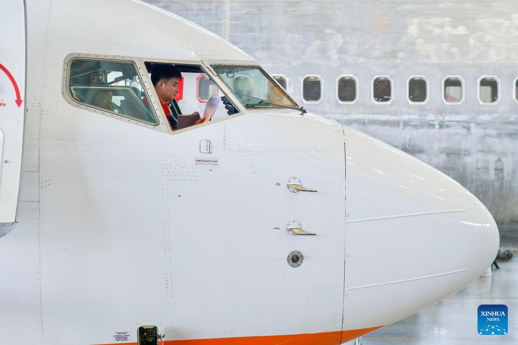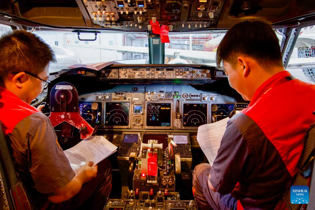 Staff members of Grand China Aviation Maintenance Co., Ltd. (GCAM) operate inside the cockpit of an inbound airplane at a hangar of an aircraft maintenance base in Haikou, south China's Hainan Province, May 13, 2024. (Xinhua/Zhang Liyun)