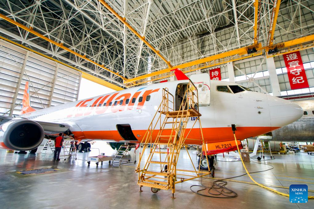 Staff members of Grand China Aviation Maintenance Co., Ltd. (GCAM) maintain an inbound airplane at a hangar of an aircraft maintenance base in Haikou, south China's Hainan Province, May 13, 2024. (Xinhua/Zhang Liyun)