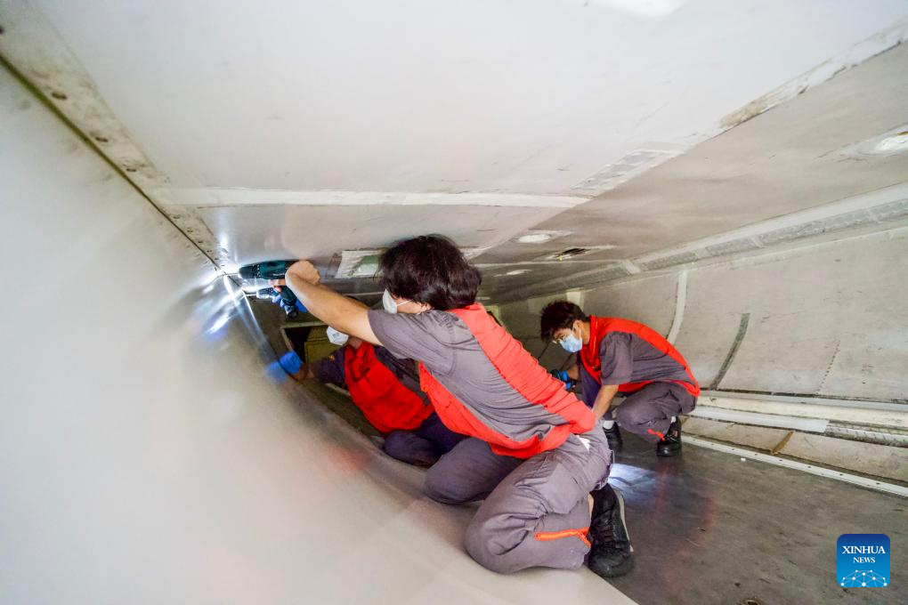 Staff members of Grand China Aviation Maintenance Co., Ltd. (GCAM) operate inside the cargo hold of an inbound airplane at a hangar of an aircraft maintenance base in Haikou, south China's Hainan Province, May 13, 2024. (Xinhua/Zhang Liyun)