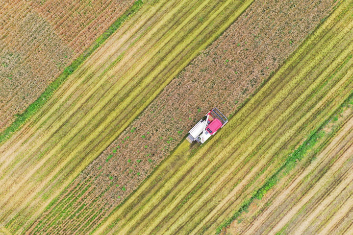 A harvester reaps wheat in a field in Tongzi county, Zunyi city, southwest China's Guizhou Province. (Photo/Chen Guiliang)