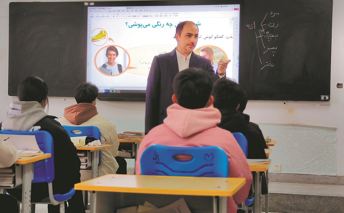 Morteza Akbari gives a lesson on Persian at Linxia Modern Vocational College. CHINA DAILY