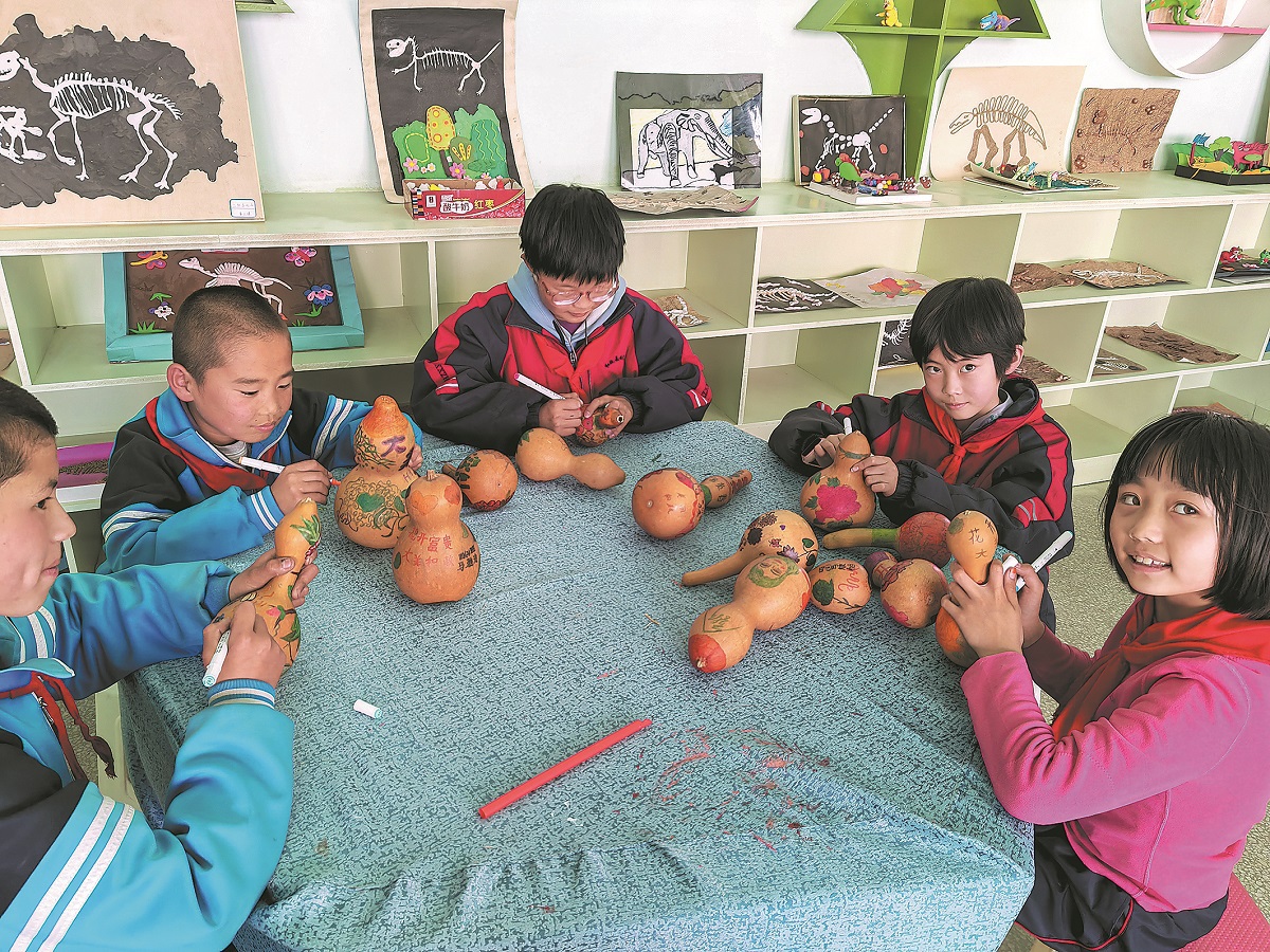 Students from Xiguan Primary School paint extinct animals found in the geopark on gourds at a handicraft club. CHINA DAILY
