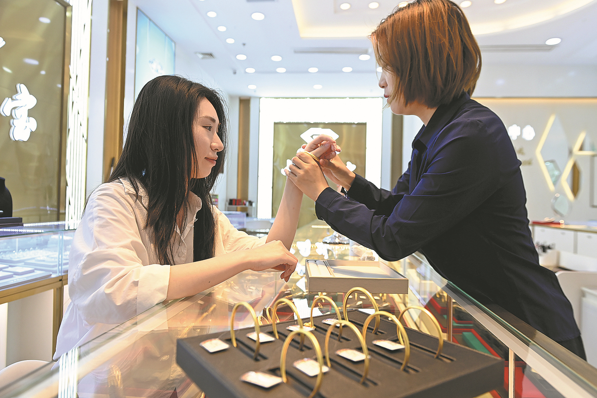 A shopper tries on a gold bracelet at a jewelry store in Chongqing. SUN KAIFANG/FOR CHINA DAILY