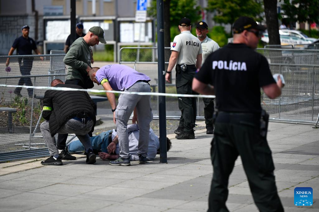A man is detained on the site where Slovak Prime Minister Robert Fico was shot and wounded in Handlova, Slovakia, on May 15, 2024. The wounded Slovak Prime Minister Robert Fico is still in critical condition and is undergoing surgery, Slovak Deputy Prime Minister and Defence Minister Robert Kalinak said Wednesday evening. The attack has been classified as an assassination, with the gunner firing five shots, according to Slovak Interior Minister Matus Sutaj Estok. He added that the attack was "politically motivated." Fico was wounded Wednesday afternoon after attending a government meeting in the town of Handlova, some 150 km northeast of the capital. (News Agency of the Slovak Republic/Handout via Xinhua)