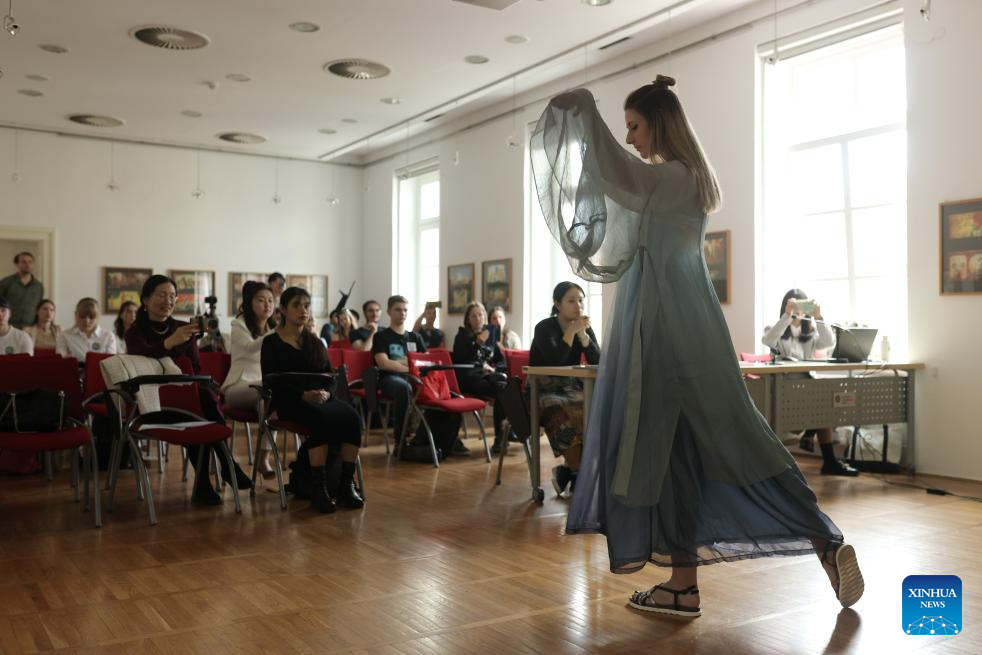 A contestant performs during the 2024 "Chinese Bridge" Chinese proficiency competition in Ljubljana, Slovenia, on May 15, 2024. Thirteen students from Slovenia's high schools and universities participated in the 2024 "Chinese Bridge" Chinese proficiency competition here on Wednesday. (Photo by Zeljko Stevanic/Xinhua)