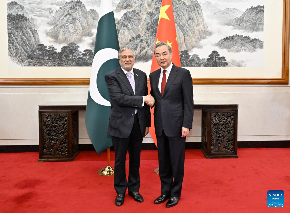 Chinese Foreign Minister Wang Yi, also a member of the Political Bureau of the Communist Party of China Central Committee, and Pakistani Deputy Prime Minister and Foreign Minister Mohammad Ishaq Dar attend the fifth round of the China-Pakistan Foreign Ministers' Strategic Dialogue in Beijing, capital of China, May 15, 2024. (Xinhua/Yin Bogu)
