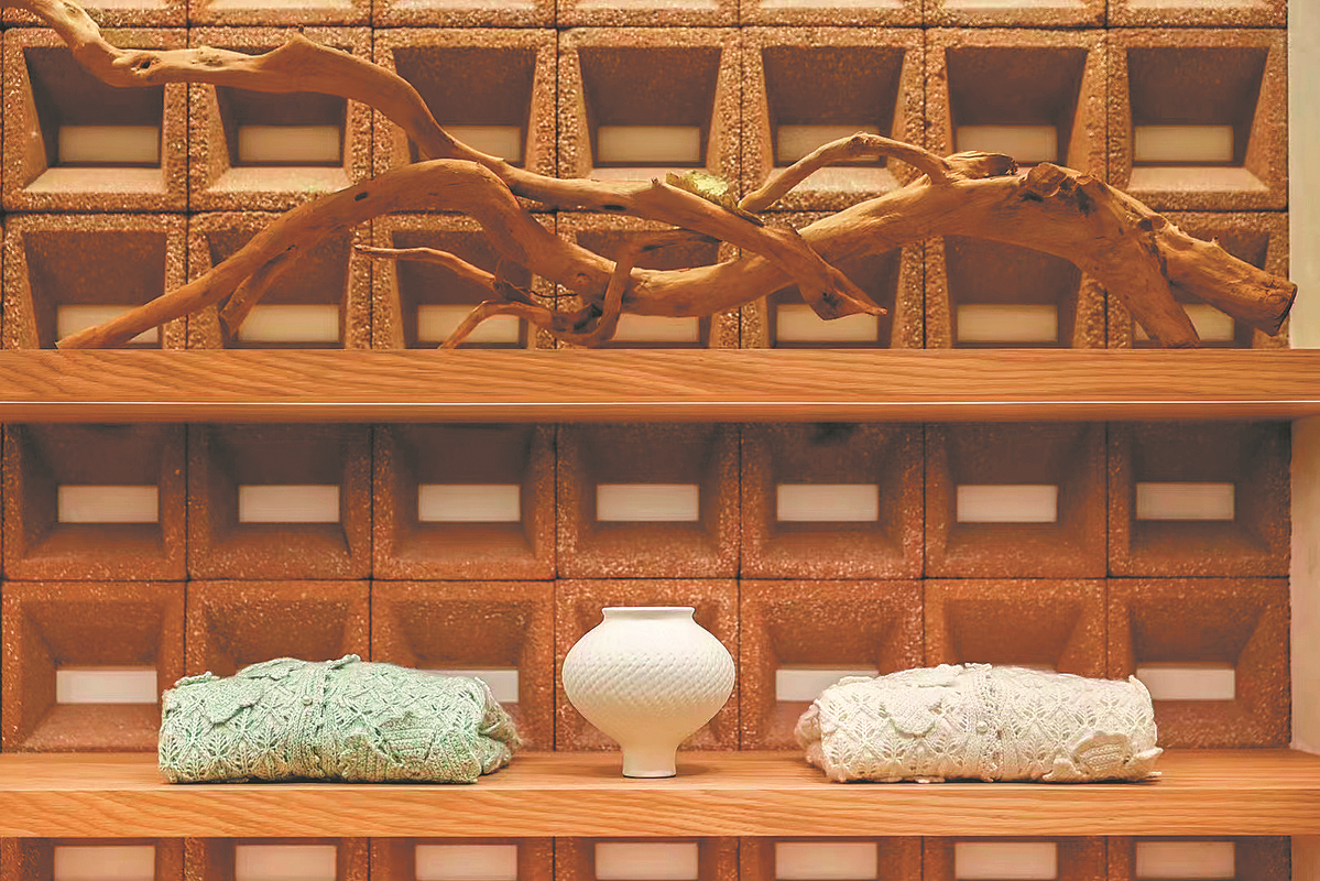 Hollow bricks made of waste ceramics are used as a backdrop for products at a wool sweater store in Shanghai. CHINA DAILY