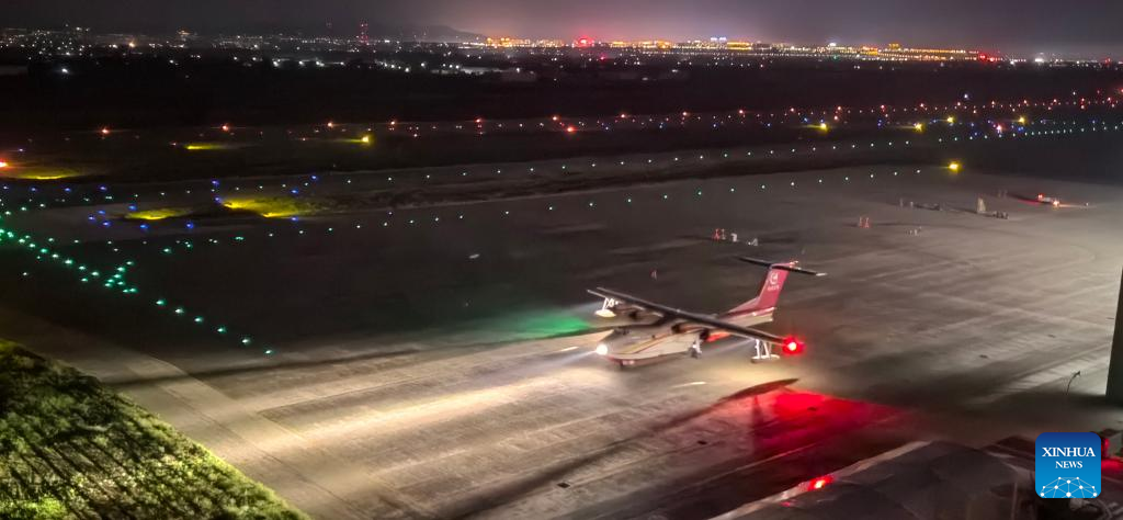 China's AG600 large amphibious aircraft completes its first night test flight at a test flight base for civil aircraft in Pucheng, northwest China's Shaanxi Province, May 7, 2024. (Aviation Industry Corporation of China/Handout via Xinhua)