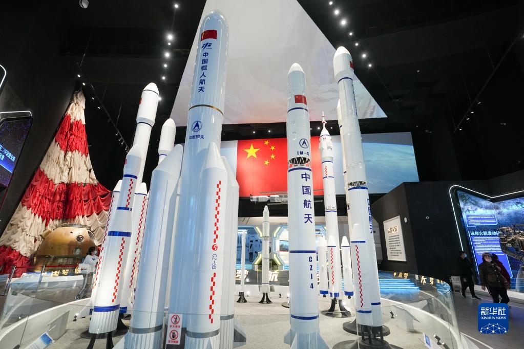 Visitors view models of the Long March carrier rockets on display at the China Space Museum in Beijing, capital of China. (Xinhua/Ju Huanzong)